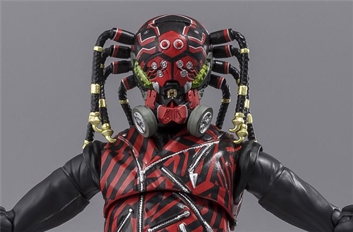 The gas mask-shaped mask, which cleverly incorporates a spider design, has been meticulously recreated down to the smallest detail. The texture of the dreadlock-like decorative parts that hang down from the sides of the mask, reminiscent of spider legs, and the green light-emitting elements that run from the cheeks to the sides of the head are made of clear parts. The complex paintwork of the entire mask has also been achieved through multiple processes.