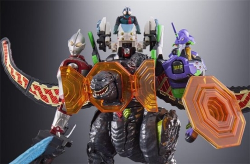Godzilla, Evangelion Unit 01, Ultraman, and Kamen Rider transform from their respective states and combine into a "Shin Universe Robo" with a total height of about 240mm! We have ideas that can only be realized with this item, such as having a weapon that combines Ultraman's Specium ray effect and Godzilla's dorsal fin, and using Evangelion's AT field as a shield.