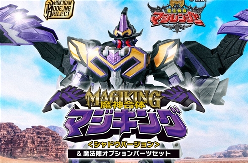 Whether combined into "Magic King" or "Magic Holy Dragon" forms, the new models boast more stylish styling, proportions, and greater mobility than the DX versions. Each unit's small arms can be combined into the "King's Sword," wielded by the Magic King, allowing for a dashing display of his ultimate move, "Magic Slash." Accessories include a seamless, purple, transparent "Large King's Sword," a magic circle effect for the Magic King, and a magic circle effect for the Black Wolf Caesar, allowing for compatibility with the Shadow version of the Magic King and other SMP Magic Sentai merchandise.
