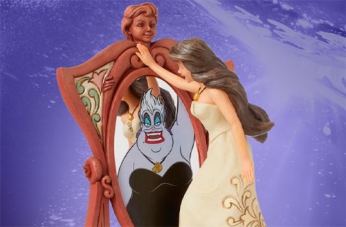 In this bewitching piece by Jim Shore, Ursula, the seawitch, is depicted in her human form, transfixed as she gazes into a mirror that unveils her true nature. In exquisite detail, the scene captures the villain in a transformative moment.