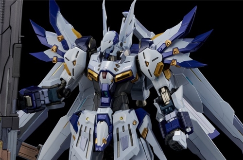 The movable frame is constructed primarily of alloy parts, combining joint strength with excellent articulation, allowing for a stylish high kneeling pose. The "Tesla Flight Device" wings on the back feature an original unfolding mechanism, allowing the wings to unfold vertically to reveal the transparent internal components. The head of the aircraft also houses an LED lighting mechanism.