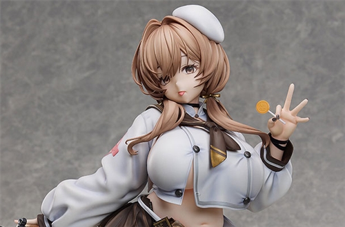 From "GODDESS OF VICTORY: NIKKE" comes a 1/4 scale figure of the Tetra Line Cooking Oil Unit member, Bready! Her eye-catching proportions have been carefully sculpted based on her character design and official illustration. Gently tilting at the waist while playfully holding a lollipop, her teasing pose faithfully captures her charm in figure form. Special attention has also been paid to the visual appearance of textures, including the clothing hugging her curvy physique and the transparency of her stockings.