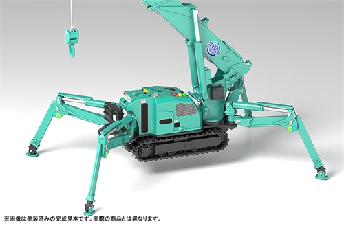 The spider crane used in construction projects across the world is now a plastic model kit! Presenting a 1/20th scale PS plastic model of the MC174CRM spider crane. The crane's boom arm is extendable and its outriggers can be displayed deployed or compactly stored. The hydraulic cylinders can also be moved in accordance with the movement of the boom and outriggers. The model can be converted from its compact folded form for storage to its deployed form without the use of additional parts. A cable for attaching the hook of the crane is included as well. The model kit is split up into green and grey runners and comes with stickers, making it easy to create the crane with a simple assembly.
