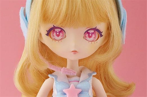 The Ebifurai no Shippo doll features a colored wig, original makeup and eyes based on Ebifurai no Shippo's design. The original outfit consists of a blue scalloped dress. A cheering Agekko is printed on the back. Adorable details such as the winged headphones, tulle bustle and star detail on the arm are not to be missed. Additionally, an original Ebifurai no Shippo charm can be dangled from the shoulder. Be sure to add the angellic idol to your collection.