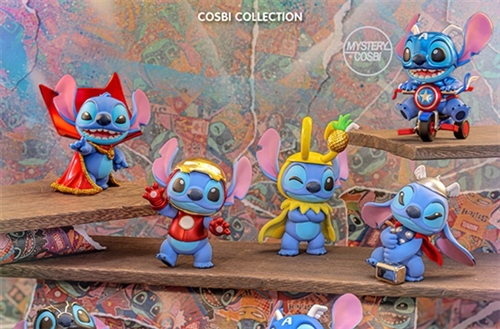 Stitch, mashed up with popular Marvel characters in a Hot Toys exclusive design, has been recreated as a miniature figure measuring approximately 9-12cm in height. The lineup includes eight figures: Stitch dressed as Spider-Man, Iron Man, Captain America, Thor, Loki, Black Panther, Doctor Strange, and Rocket. There's also a rare chance for a secret to appear: a metallic version of Stitch/Captain America riding a motorcycle! Each figure comes with a trading card. The packaging is a blind box, allowing you to enjoy the excitement of not knowing what's inside.