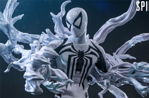 The full set of Anti-Venom suits is mainly white, which forms a sharp contrast with the huge black spider logo, presenting a minimalist and cold visual atmosphere. The suit