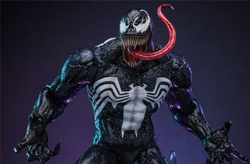 The greatly detailed collectible figure is expertly crafted to represent Venom from Marvel Comics It features a strikingly grinning head sculpt, as well as a head with a menacing fanged mouth and three interchangeable protruding tongues. Standing at approximately 39 cm tall and featuring iconic white spider emblems, the specialized body showcases a high level of detailed sculpting, especially on the skin texture. It includes several symbiote accessories with tentacles that can be attached to the figure's back, enhancing the dynamic presence of this iconic character. The collectible also comes with a symbiote-themed diorama base that brings the comic scene to life.