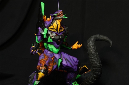 It's been about four months since I last made this same kit, and this time, it was a client's commission. The request was to paint the Godzilla creature parts to resemble Crimson Godzilla. The focus was on Crimson Godzilla's colors, while also adjusting the colors of Unit-01 itself. Using the cracks in the left arm armor and the left palm, I created a flaming palm design, painting the indentations in the cracks to create a burning effect. From the palm to the arm, I used a gradient of bright yellow to dark red to create a layered effect. To complement Crimson Godzilla's intensely flaming effect, Unit-01's mechanical parts were given a more three-dimensional feel, with stronger colors used for both linework and shadows. The mouth also used more color to create a more organic feel, while Godzilla's dark skin was further enhanced with dry-brushing and staining to create a more three-dimensional effect. I'm very happy with the client's ideas, and the resulting product is truly unique. I hope you enjoy it!