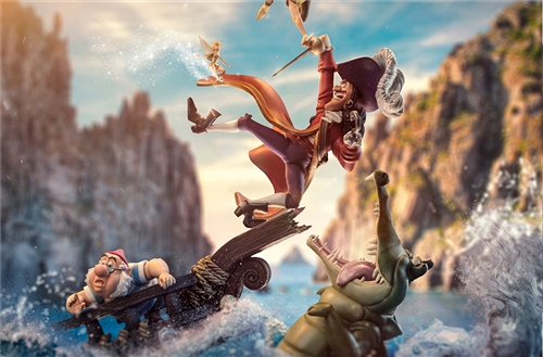 Iron Studios will also release the statue in the regular version "Peter Pan Vs Hook – Disney Classics 100 Years – Art Scale 1/10" with the boy hero facing the infamous pirate in the bow of his ship, the Jolly Roger, with a big clock, without the other characters in the set. And the limited statue "Peter Pan Vs Hook 100th – Disney Classics 100 Years – Art Scale 1/10", with an especially decorated silver base, with a frontal plaque celebrating Disney’s 100 Years, another special item for fans and collectors to commemorate and remember this centenary, just like the other statues from this collection revealed previously, this one is also made in an edition limited to only 100 units.