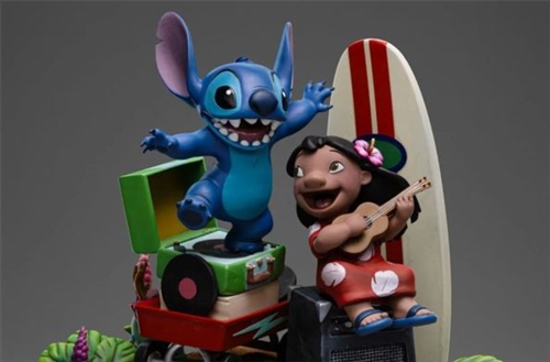 On a base of sand and vegetation from the Hawaiian beaches of Kauai Island, a small, charismatic, and cute girl, wearing a traditional pink printed dress from her culture, joyfully plays her Ukulele while sitting on a small guitar amp, with a photo of her parents and a camera in front of the speaker screen—two items of great importance to her, along with an equally essential surfboard. With seashells, a starfish, and an alien ray gun fallen on the sand, beside her, her red wheelbarrow carries her suitcase turntable where her best friend from another world dances naturally, sometimes as a King of Rock duet, sometimes as a superhero with a red cape, or sometimes with a traditional Hula skirt and necklace. With the base adorned with waves around it, Iron Studios proudly presents the statue "Lilo & Stitch Deluxe - Disney Classics - Art Scale 1/10", with four optional versions of Stitch: normal, as Elvis, as a superhero, or dancing the Hula, expanding its commemorative collection of Disney's 100 years.