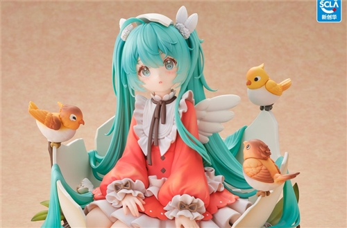Based on Kaiyodo's original concept themed around "little birds," this 1/7 scale figure brings to life an illustration by Bison Kurazumi. Bathed in dappled sunlight, it depicts Hatsune Miku as a newborn. The figure is presented in a vignette style, with Hatsune Miku sitting amidst a bird's nest and a broken eggshell. The costume features soft colors reminiscent of the dappled sunlight in the background, and meticulous detail is evident in the paintwork, from the transparency of her hair to the sparkle of her fingertips.
