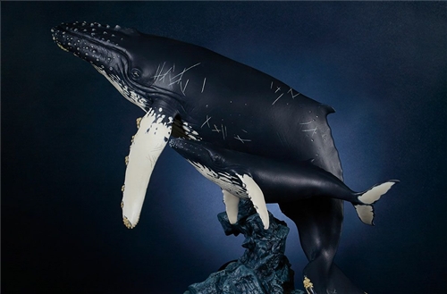 Humpback whales, which are about 13 to 15 meters in length, inhabit the oceans around the world, and are also known for singing courtship songs with their own unique melody for each group. "Nature Tales" presents a three-dimensional figure of a parent whale swimming leisurely as if snuggling up to its calf. It is an angle that allows you to carefully observe the characteristic long and large pectoral fin silhouette and the barnacle-covered protrusions from the upper surface of the upper jaw to the side of the lower jaw. In the waters near Japan, they give birth in the warm Ogasawara Islands and Okinawa's Nansei Islands as breeding grounds in the winter, and in early spring when the calves have grown enough to withstand a long journey of several thousand kilometers, they leave for northern areas such as the Bering Sea where there is plenty of food. However, it is said that the parent whale spends most of its time without eating and drinking during this period, and the model also expresses a smart atmosphere with reduced subcutaneous fat.