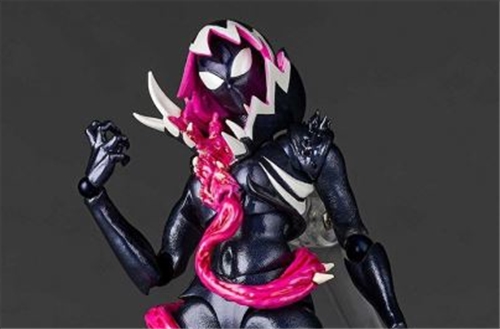 The jet black figure is wrapped in the symbiote, and Venom's fanged jaw is arranged as the hood of the hoodie. The design skillfully incorporates Spider-Gwen's image color pink, which stands out against her supple proportions!