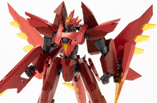 Inspired by tropes in robot anime of rival mecha, the primary color of the model is red and the clear parts are orange, which stands in stark contrast to the white of the first model.