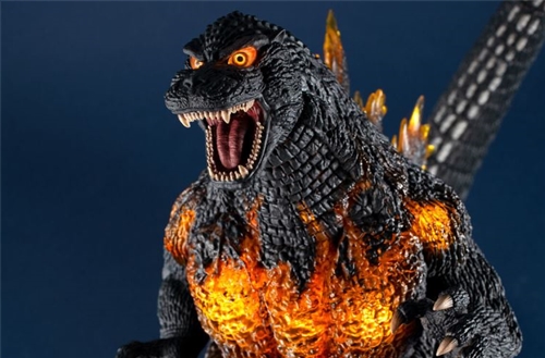 "Gimmick ON1," which can be switched by operating a switch, recreates the scene from the opening scene of the film, where it lands on the streets of Hong Kong and roars, while "Gimmick ON2" recreates the scene of it emitting radiant heat rays and abnormal radiant flames with light and sound effects. The eyes, dorsal fin, and various parts of its body, as well as the inside of its mouth, light up, and "ON1" plays the sound of a roar and the sound of its dorsal fin glowing. "ON2" plays the radiant heat ray firing sequence and the abnormal radiant flame emission sequence.