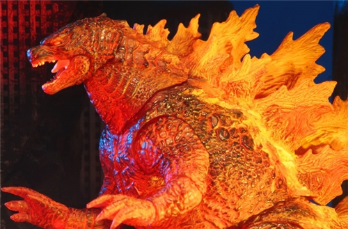 This figure represents Godzilla illuminated by a bright red fire, as it appears in the final battle of the film against King Ghidorah .
