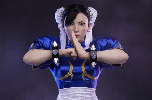 Chun-Li's portrait features a lifelike silicone head and arms along with synthetic hair to create a fully formed realistic depiction of this female martial arts master. Mixed media accessories and white ribbons hold Chun-Li's hair up in her iconic ox horn hairstyle. Along with her classic red eyeliner and pointed-brow look, Chun-Li's expression is stoic and disciplined as a seasoned upholder of the law.