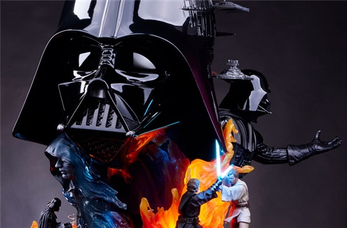 "Darth Vader Fine Art Bust" is approximately 22 inches (approximately 55.8 cm) tall. In addition to using a 1/1 scale to create Darth Vader's classic black helmet, it also injects the "From the Chosen One" Classic moments in which a man fell into evil and transformed into the Terror Lord of the Empire, including the showdown between Anakin and his former mentor and best friend Obi-Wan Kenobi on the magma planet Mustafar, in an attempt to win over Luke. Join the dark side with a bust of Vader with his left hand extended, as well as a scene of him kneeling in submission to the Sith Lord.