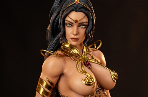 This fully sculpted 1:2 scale statue stands nearly 44” tall and portrays the proud regent as she strides confidently with her sword in hand. Keeping to the Martian custom, Dejah shuns traditional clothing, instead adorning herself with an assortment of ornate gold jewelry. The design of her jewelry seems otherworldly as well, its organic swirls and arcs conforming neatly to Dejah’s shape. Vibrant red gemstones complement the Princess’ attire from her tiara to her sandals, adding to her regal appearance.