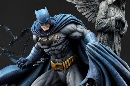 Standing atop the ruins of Gotham Cemetery, this 28-inch-tall Batman statue embodies the hero’s brooding presence and relentless spirit. Batman is captured in a powerful yet dynamic pose, his muscular physique meticulously sculpted to showcase every sinew and contour that defines his strength and agility. Ready to leap into action, his left fist grabs at his voluminous cape as it billows around him, its scalloped edge resembling bat wings caught in an unseen wind. The base features intricately crafted concrete blocks, weathered and worn, hinting at the passage of time. An angel statue looms behind the Caped Crusader, its serene yet somber presence adding a haunting beauty to the scene.