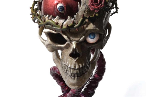 Prime 1 Studio artisans, in full reverence to the late Sensei Miura, have taken the time and care to produce a worthy accompaniment to the rest of the Berserk line of amazing statues. Direct from the manga, the almost 8-inch-tall Behelit Skull is held aloft by tentacles of ooze, surrounded by a crown of thorns, and encases a Crimson Behelit in its cranial cavity. It is the perfect representation and amalgamation of Sensei Miura’s diverse themes. The minimal, metallic base is unobtrusive and goes well with the Berserk theme.