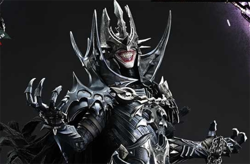 The Batman Who Laughs stands in a commanding pose, embodying immense power and ambition. A sharply reimagined visor. Steel tones with a subtle bluish hue. A sinister black cape flowing ominously. Every element of color and sculpt comes together to create a dark and majestic presence.