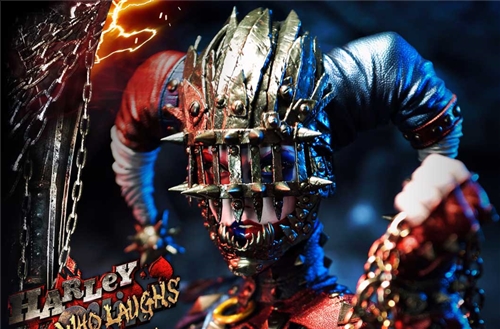 At a whopping 30 inches tall, Harley Quinn Who Laughs is brought to life in her signature red and blue costume, beautifully rendered in metallic and leather textures, a form-fitting ensemble that accentuates her dark allure. The generous use of spikes exudes an air of danger and rebellion, how metal! Her face is encased by an iron caged-style mask, a twisted fusion of metal and darkness that instills fear at its very sight. Alternatively, another swappable head portrait is available for you to display on a headstand, revealing the beautiful face beneath the mask, her peculiar face paint contoured by golden locks. The Queen of Chaos strikes an imposing presence, dark chains in her left hand, holding back her hyenas Bud and Lou. Their eyes gleam with savage hunger and snarling expressions, ready to unleash a brutal and merciless fate upon their prey. She holds a massive meat cleaver that is still dripping with fresh blood. At her feet is a heavy metal ironclad base of pure despair, rubble, chains, blood stains, and skulls, just the right combination to make your skin crawl.