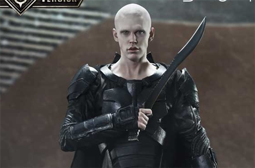 Sunken eyes casting a mysterious shadow, pale skin, and a refined yet unsettling face—this portrait is unmistakably Feyd-Rautha, brought to life with uncanny likeness to Austin Butler, who portrayed him on screen. His black and white blades form sharp edges and graceful curves, while the combat suit is fully recreated down to the worn armor plates and woven fabric textures. The removable cape is made of real fabric, producing natural drape and flow. The base beneath his feet combines the deserts of Arrakis with the emblem of House Harkonnen for a weighty finish.