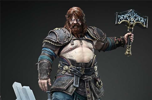 This 1/3 scale statue brings to life the essence of Thor—a destroyer burdened by sorrow—through strikingly realistic sculpture. His piercing eyes, the scar trailing under one, and tattoos brimming with mystic power evoke his mythical presence. His bearded face, partially shadowed by disheveled hair, is meticulously crafted to capture a brooding expression. From the bulging torso atop layers of thick muscle to the powerful limbs shaped like tree trunks, every inch is carved with deep-set wrinkles and rugged skin textures that speak of a long and weary path. The leather armor and belts are adorned with traditional patterns, while the weathered metal embellishments have been painstakingly recreated. Even Mjölnir, the symbol of his wrath, combines a brutal silhouette with delicate detailing—a piece of both destruction and mystique.