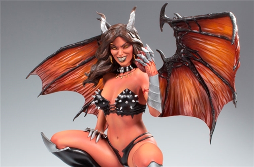 Based on Brian Pulido's comicbook vixen and artwork by Mike Krome, Hellwitch crouches atop a pile of ash and bone clutching the heart of her last victim. Measuring 14.5” to the tip of her horns, she displays her impressive 17.5” wingspan among a highly detailed 1:5 scale form. Every detail is there, from her thigh-high boots and armored gauntlet to that come hither smile that lets you know she is up to no good.