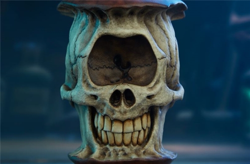 This apple resembles the desiccated skull of a one-eyed monster, with a sinister smile stretched wide under a single, cavernous socket. Dark, shriveled, red and brown apple skin frames the smooth texture and bone-white color of the inside flesh. Measuring 3.56" tall, this ancient artifact is, at its core, a coveted replica ready to join your island of horror collectibles.