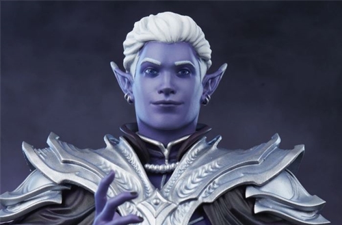 The Essek Thelyss – Mighty Nein Statue appears to hover above a hexagonal faux-stone base engraved with the Mighty Nein monogram, showing his allegiance to the team of adventurers. He wears a dark cloak overlaid with ornate silver shoulder armor, and beneath it is a set of Xhorhasian-styled garments that complement his purple complexion. Essek’s handsome elven portrait features short white hair and silver ear jewelry accenting his self-assured expression. Pair this Critical Role collectible with members of the Mighty Nein, including his eventual partner Caleb Widogast, for an even more powerful party of world-saving heroes.