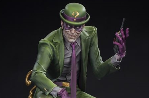 Inspired by the character’s comic book appearance, The Riddler Premium Format Figure presents this Gotham City villain at his most cunning and condescending. He wears his classic green suit and bowler hat, a purplish gray undershirt, and a purple tie and mask with matching dress socks and gloves. The DC statue’s industrial base is rife with risks aimed to test the so-called World’s Greatest Detective. If The Riddler wins, Wayne Tower goes BOOM! So, tick, tock. Time’s almost up.