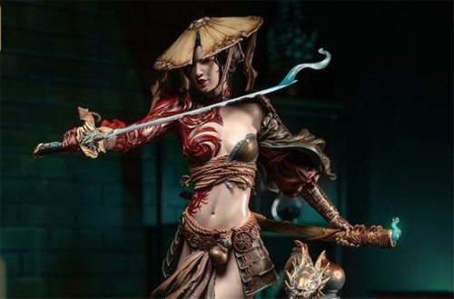Slaier: The Undying Blade Premium Format Figure is fully sculpted with intricate textures and details that combine the mythic and the macabre into one deadly, desirable design. Walking between worlds, Slaier draws her sword as a hint of smoke-like spirit curls off the tip of the blade. The assassin’s living sleeve tattoo coils and writhes up her arm, forming the demonic mask of her Face of Vengeance portrait. An unmasked portrait is also included for an alternate display option, revealing a beautiful, focused expression of vengeful purpose.
