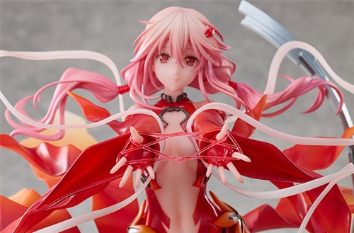 From the popular anime series "Guilty Crown" comes a 1/7 scale figure of the songstress Inori Yuzuriha! The figure is based on the memorable scene of Inori with her arms stretched out holding the Cat's Cradle. Her long, cherry blossom-colored hair flows softly in the breeze, emphasizing her dainty looks. Her soft expression exudes an air of fragility, perfectly balancing the mystique of a songstress with the delicateness of a young girl. Her goldfish outfit features a gradated color scheme going from crimson to orange, highlighting the three-dimensional shadows. The airy frills are sculpted to appear like swaying fins underwater, giving the figure a sense of motion even while still. The base of the figure is inspired by the Void Effect from the series, and the silver frame and parts intertwine to create an impressive display reminiscent of the final scene of the series. Be sure to add this special figure to your collection!