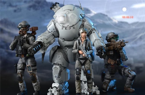 The female pilot wears a fireproof jumpsuit in winter combat colors, complete with safety harness and a anti-collision communication helmet, along with a 1/18 MP7 personal defense weapon. This armor suit over 20 points of articulation. The XO-02 armor suit also includes two special forces soldiers in winter combat uniforms. One sergeant soldier is equipped with integrated visual augmentation system helmet, shoulder-mounted laser sight, 1/18 scale MK16 5.56mm rifle/EGLM 40mm grenade launcher, and a 1/18 scale G17 9mm pistol with flashlight, the figure over 25 points of articulation. The other special forces soldier features a heads-up display helmet and gas mask, shoulder-mounted mini four-tube launcher, 1/18 scale G36 5.56mm assault rifle with tactical accessories, and a 1/18 scale P226R 9mm pistol with high-capacity magazine, also having over 25 points of articulation.