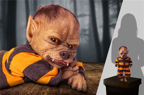 Cooper is the size and weight of a newborn with added spooky charm! He features a solid silicone head, arms and legs attached to a weighted plush furry body, giving the look and feel of holding a real live baby werewolf!