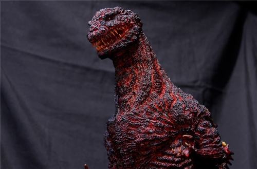 I was fortunate enough to receive this enormous Godzilla kit from Taiyo Workshop, standing 50cm tall at the head and 80cm at the tail. The packaging was perfect, and there was no damage to any parts upon opening. The painting request was roughly as follows: the overall color scheme was a classic red and black Godzilla, with the red skin tone adjusted to have a fleshy texture, a dark purple gradient at the base of the dorsal fin extending to the tail, and the back plates designed to match the bone color. The goal was to achieve a visually appealing black and red color scheme from a distance, while revealing the fleshy skin texture up close. The initial approach was to use spray paint to create a layered base color over large areas, followed by extensive brush painting to develop the overall texture. To achieve the fleshy texture, the darker and blood-red areas were fragmented and then reassembled into smaller, more regular areas, achieving the initial painting goals. This kit is extremely large and heavy, and the painting process always prioritized preventing damage. I hope you enjoy this commissioned work!