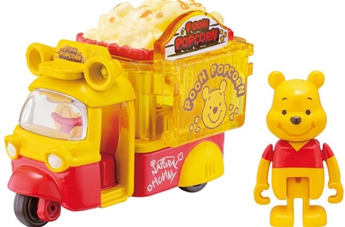 Introducing "Disney Motors Doobie Pooh" from Dream Tomica! This is the Doobie, a three-wheeled working vehicle carrying honey popcorn. Look closely at the popcorn's toasted surface and you'll see a bee mark. The clear parts of the vehicle's body are designed to resemble honey. Includes one Winnie the Pooh figure.