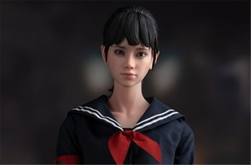 A head sculpt with scars from the squint, heavy makeup and a bun-tied hair style