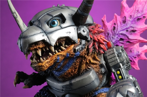 "DEFOREAL Machine Tyrannosaurus: G Corrosion Mode" is made in a 16 cm tall Q-version proportion, reproducing a Machine Tyrannosaurus with its body corroded by Godzilla's cells and an asymmetrical shape. The left side of the body and the mechanized head, chest, and left arm retain their original shape, but the right half of the body and tail have become like "Millennium Godzilla", and the characteristic wings and back have grown a huge purple dorsal fin.