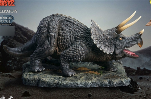 A polyresin statue of the herbivorous dinosaur Triceratops that appeared in the timeless masterpiece "One Million Years of Dinosaurs" (released in 1966) by the master of stop-motion animation Ray Harryhausen! Triceratops, who fought a deadly battle with Ceratosaurus in the play, is realistically reproduced. A special base engraved with the "ONE MILLION YEARS BC" logo and primitive people (men and women) are included, making it a must-see item for collectors!