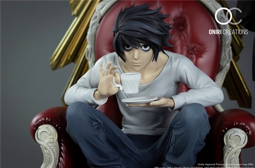 Straight out of the anime, the statue represents L wearing his usual blue jeans and white sweater in his characteristic pose, squatting on his chair, a cup of coffee in his hand. Watari stands beside her, holding a platter of L's favorite treats. Both stand in front of a totem with the symbol of L.