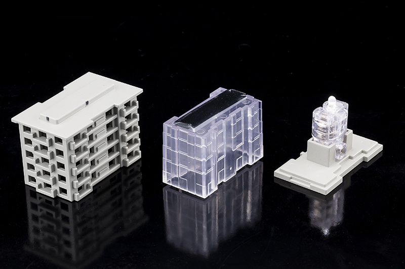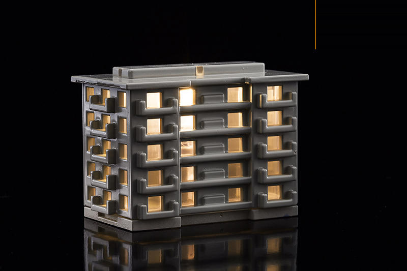 และเพื่อการผลิตตัวตึกให้มีต้นทุนที่ต่ำที่สุด (จะได้ชดเชยไปกับต้นทุนของตุ๊กตา) ก็ต้องมานั่งคิดอีกว่าจะทำยังไงให้ออกมาสวยและผลิตง่าย สุดท้ายก็เลยแยกส่วนของกระจกออกมาเป็นพลาสติก และทำตัวตึกสวมทับเข้าไป โดยมีไฟ LED เป็นฐานอยู่ด้านล่าง ซึ่งผลลัพท์ที่ได้ ก็ค่อนข้างถูกใจเลยทีเดียว