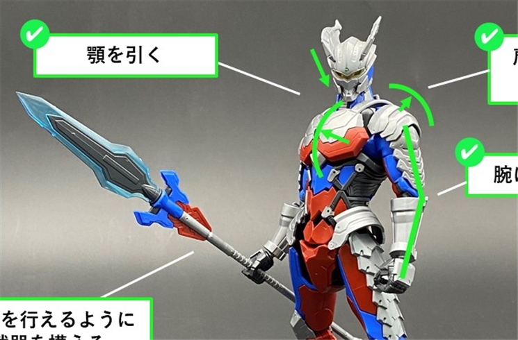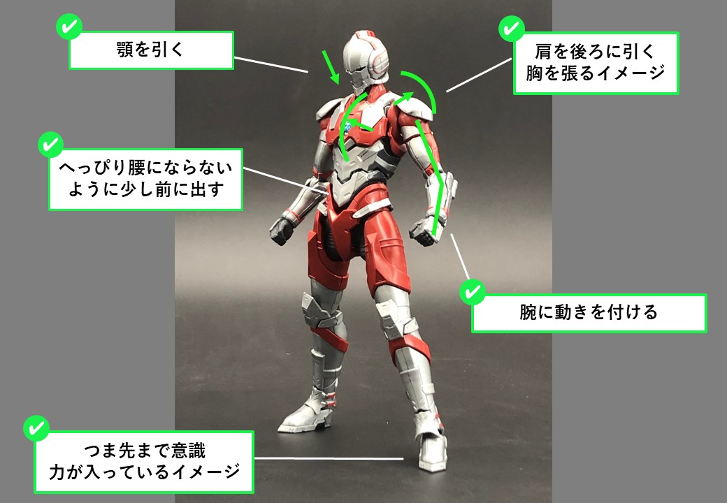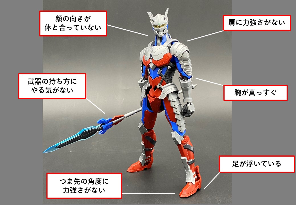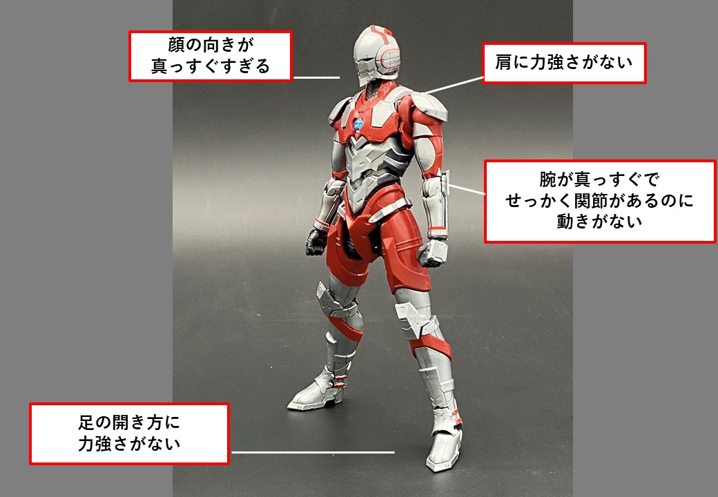 ภาพข้างต้นคงจะทำให้เห็นแค่ฟิกเกอร์ธรรมดาตัวนึง ที่นำมาวางเฉย ๆ และดูไม่มีสเน่ห์ดึงดูดใจใด ๆ เลยจริง ๆ แต่ถ้าเราปรับเปลี่ยนท่าทางเพียงแค่เล็กน้อยเท่านั้น มันก็จะดูมีพลัง และมีสเน่ห์ดึงดูดใจ ทำให้ฟิกเกอร์ดูเจ๋งขึ้นเป็นเท่าตัวเลยทีเดียว