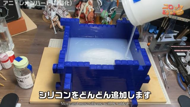 หลังจากนั้นก็ปิดแม่พิมพ์ให้ครบทุกด้าน แล้วเทสารละลายเรซิ่นใสที่เตรียมไว้จากรูด้านบน