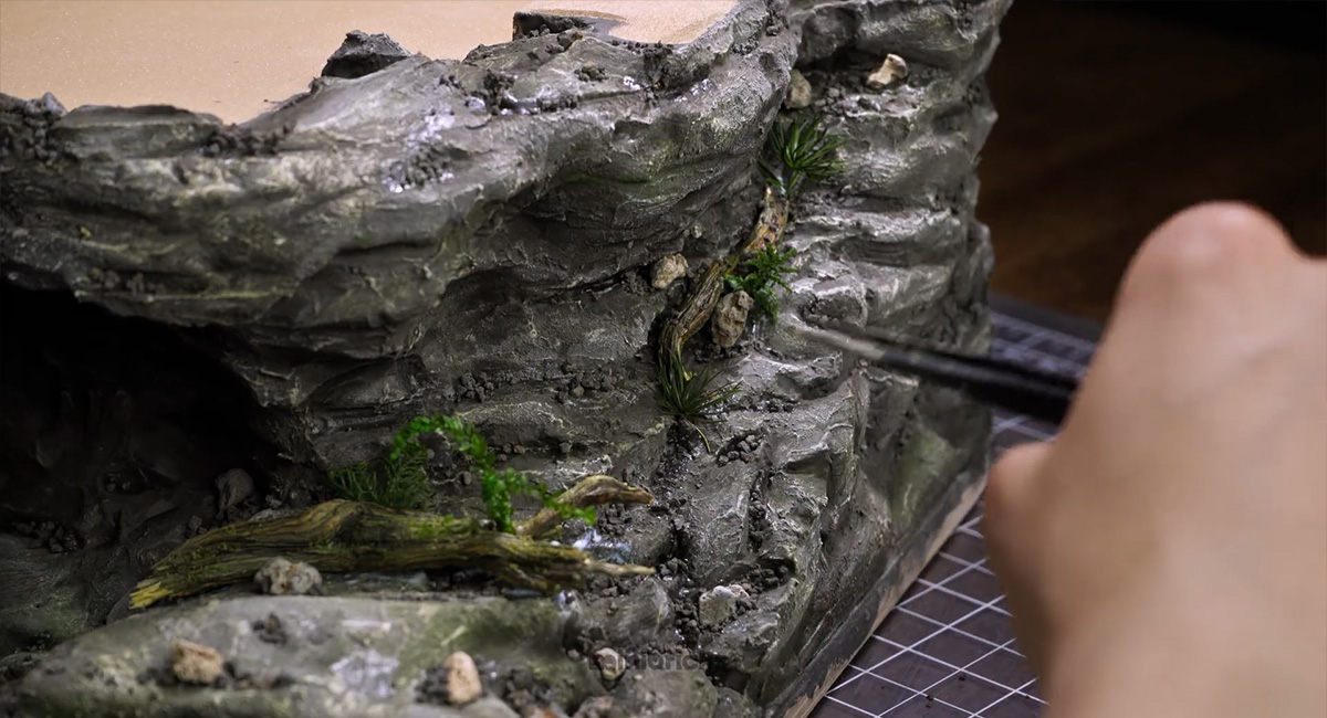 นำก้อนหิน และเศษไม้ เศษใบไม้มาประดับเพื่อความสมจริง