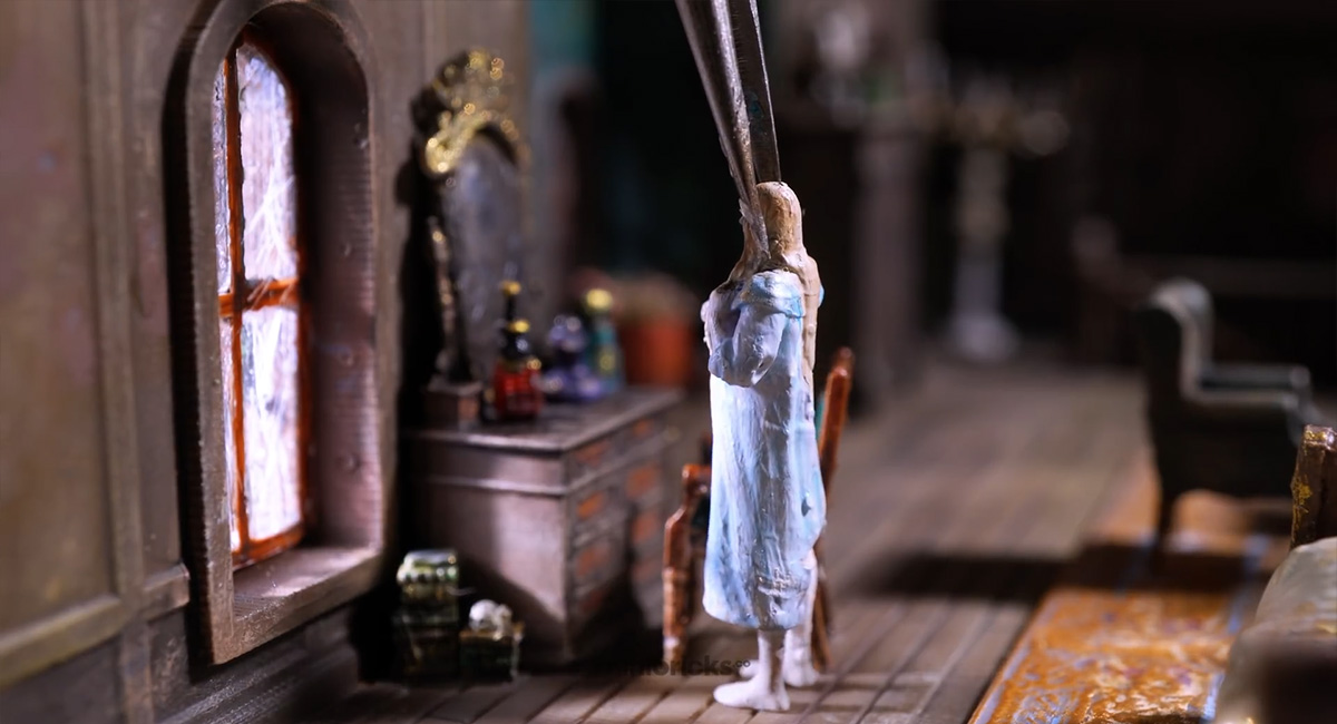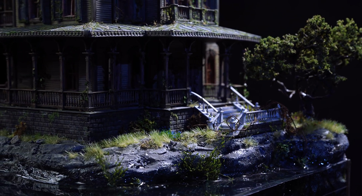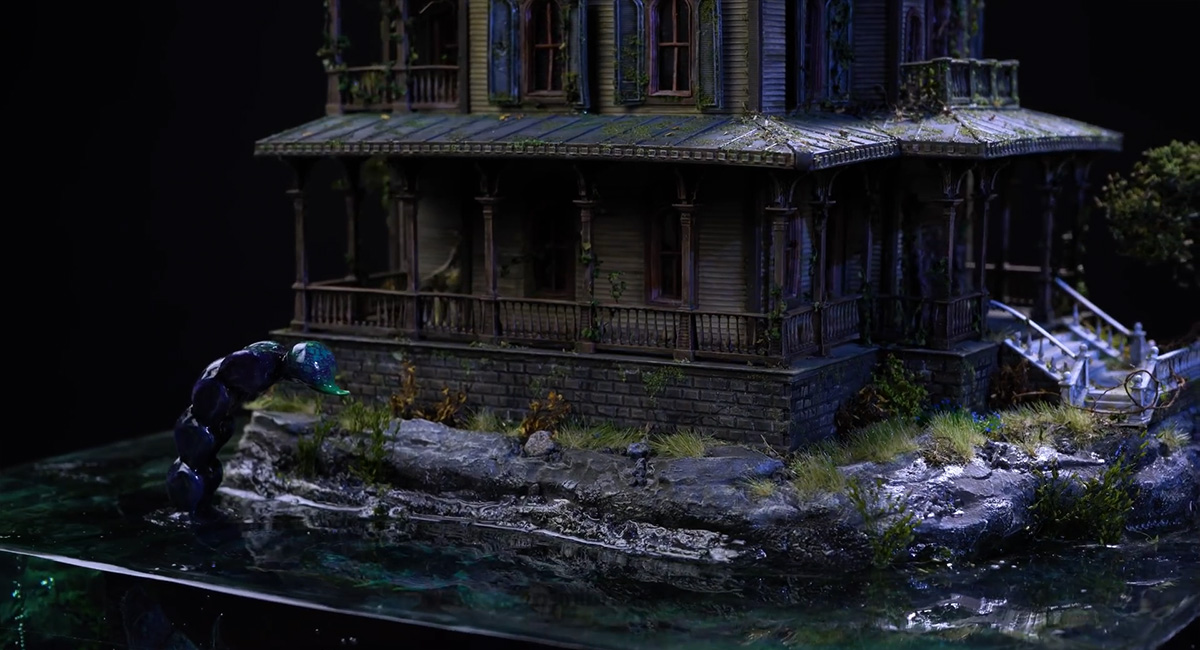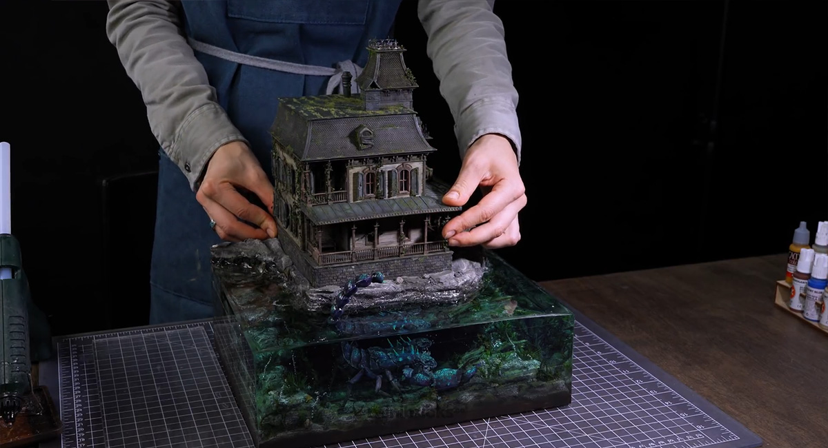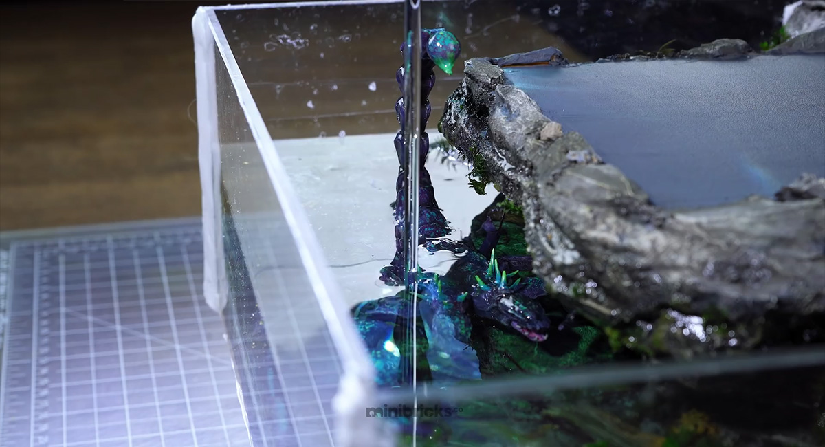 ฉากนี้ เป็นฉากที่ทำขึ้น โดยมีแม่งป่อง 2 หัวเดินอยู่ในน้ำที่อยู่รอบบ้าน ดังนั้นในส่วนถัดไป คือการนำเรซิ่นใสมาผสมกับตัวทำแข็ง แล้วนำไปเทลงไปในฉากให้ดูเหมือนน้ำที่อยู่รอบบ้าน