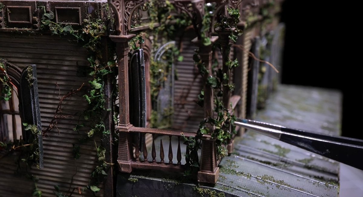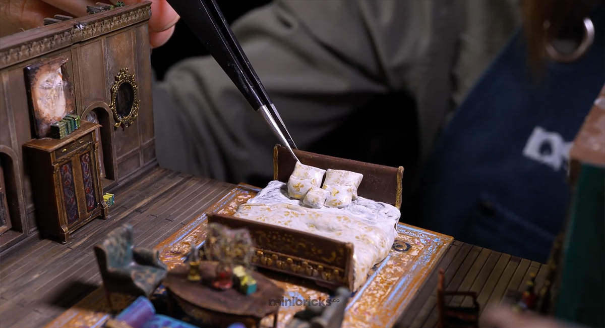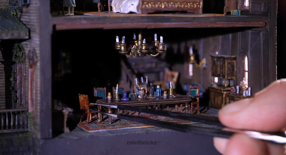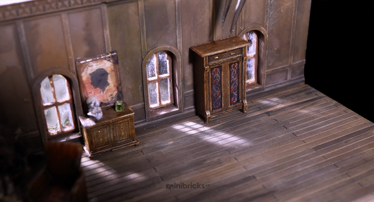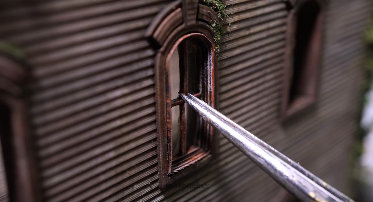 ติดชิ้นส่วนต่าง ๆ เข้าไป ไม่ว่าจะเป็นหน้าต่าง เฟอร์นิเจอร์ และอื่น ๆ ทำให้ฉากไดโอรามาของบ้านดูสมบูรณ์ยิ่งขึ้น