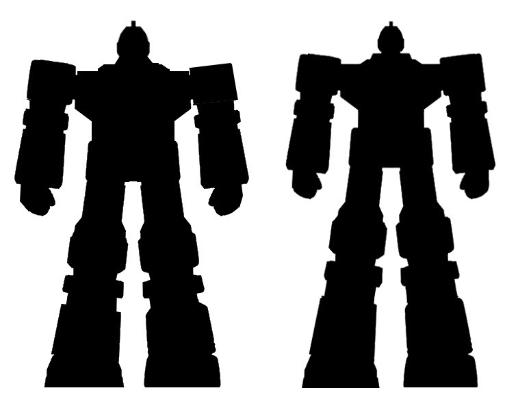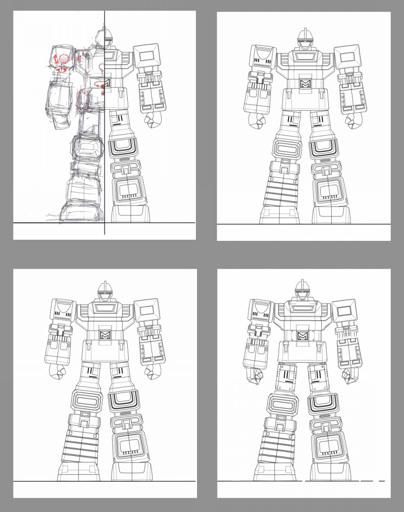 จากรูปที่เราได้เห็น ๆ กันนี้ จะเห็นได้ว่า ตัวหุ่นถูกปรับเปลี่ยนโครงสร้างอยู่พอสมควร ยกตัวอย่างเช่นภาพข้างล่างนี้ ก็คือภาพวาดขนาดของหุ่นเพื่อหาสัดส่วนที่จะทำให้เกิดบาลานซ์มากที่สุด (ลองทายดูสิว่าแบบไหนที่ถูกเลือกมาเป็นขนาดต้นแบบที่ใช้งานจริง?)